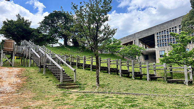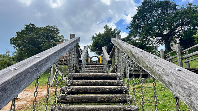 南エリアには、子どもたちが自由に遊べる遊具広場と木製階段遊具があります。 のぼったり、すべったり、たくさんの動きを楽しみながら遊べるので、元気いっぱいの子どもたちにぴったり!