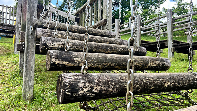 大人気の幅の大きなすべり台やつかんで登ったり、ロープの上をあるいたりワクワクする冒険気分を味わえます! 近くにはバスケットコートもあります!